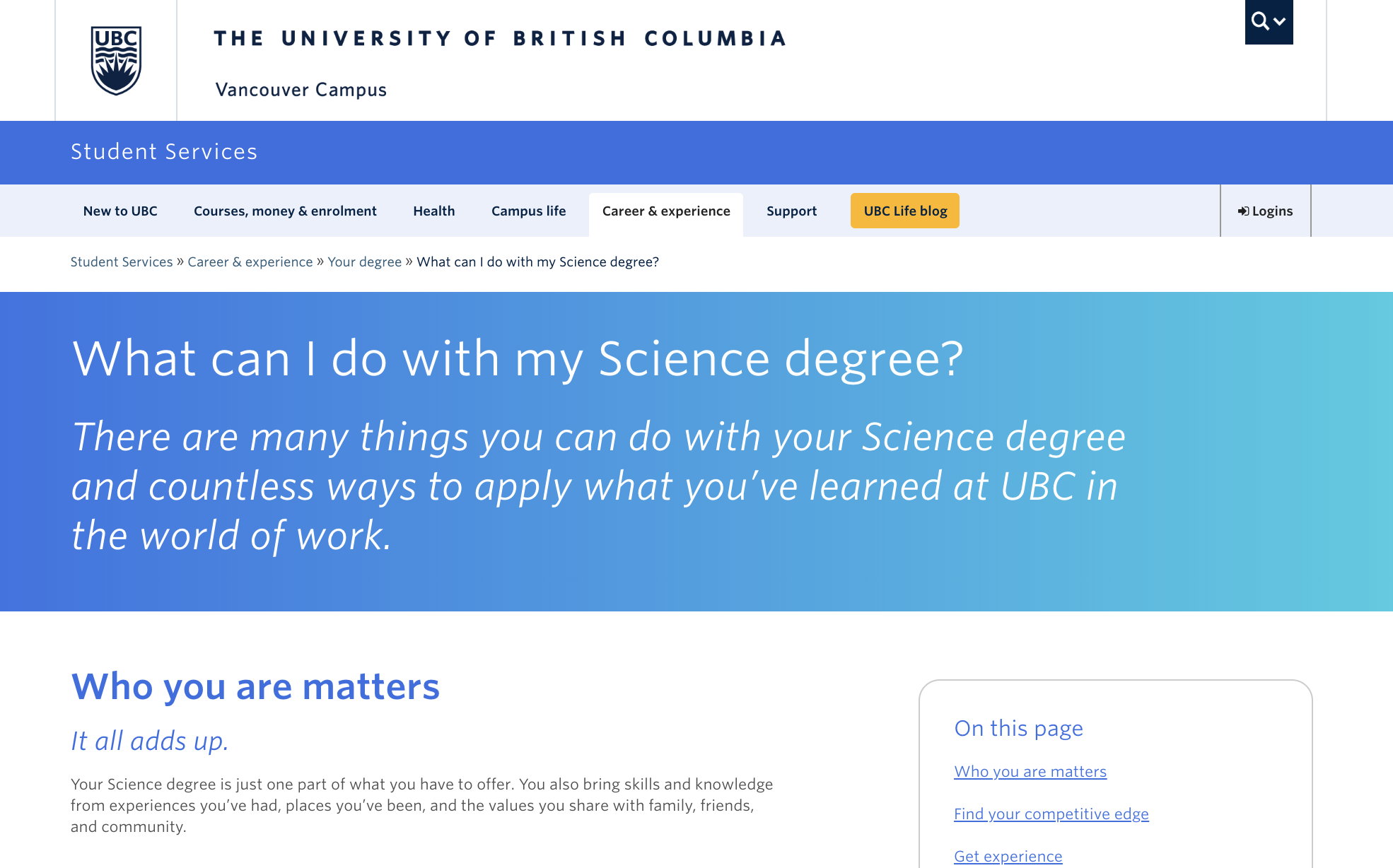 The newly launched Transfer Credit Search Tool and 'What can I do with my Science degree?’ page on UBC’s website were created to assist advisors, incoming transfer students, and UBC Science students with course and career planning. Prior to Transfer Credit Search tool launch, three phases of usability testing were performed on the prototypes, allowing for reiteration in its development.