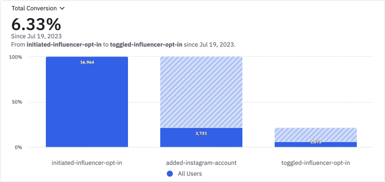 Opt-in flow - Instagram connection issues: Many users dropped off at this point either due to not meeting the requirements, or general trouble authorizing Instagram.